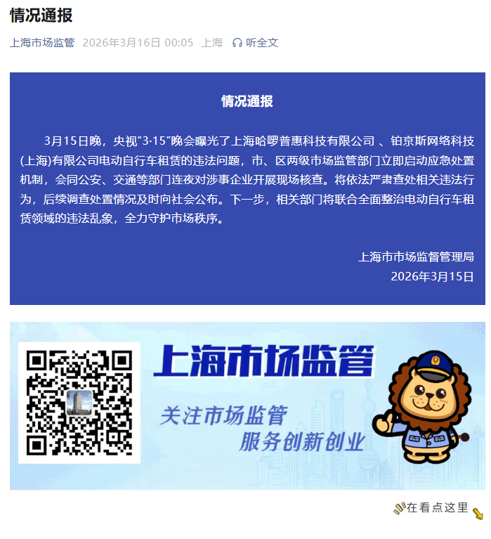 央视“3·15”晚会曝光了上海哈啰普惠科技有限公司 、铂京斯网络科技(上海)有限公司电动自行车租赁的违法问题。当晚,上海市、区两级市场监管部门立即启动应急处置机制,会同公安、交通等部门连夜对涉事企业开展现场核查,将依法严肃查处相关违法行为,后续调查处置情况及时向社会公布。